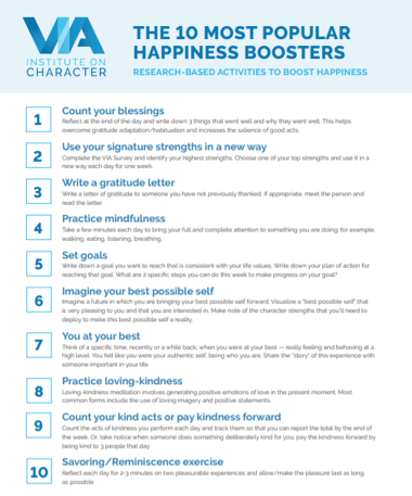- Ræða eigin hamingju og líðan og leiðir sem styrkja vellíðan, auka þekkingu á eigin hamingju, læra hvað einkennir þá sem eru hamingjusamir, þekkja sín mörk, þekkja sínar fyrirmyndir. Hjálpar fólki að einbeita sér að öðrum hlutum en peningum, þeir sem meta peninga helst hættir til að vera minna ánægðir en aðrir