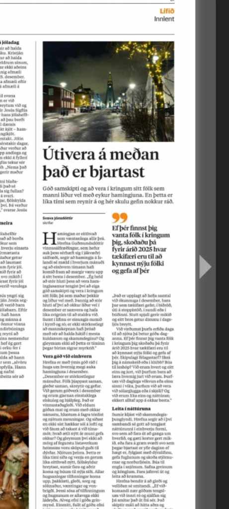 Hrefna er með ýmis góð ráð í huga um hvernig megi auka hamingju í desember. ,,Desember er stórkostlegur mánuður. Fólk þjappast saman, gleðst saman, skreytir og gefur. Við gerum góðverk í desember og erum gjarnan einstaklega elskuleg og hjálpleg. Það er haldin vinnustaðagleði. Við eldum góðan mat. Erum með okkar allra nánustu. Hlustum á fagra tónlist. Njótum menningar og lista og mátt orðsins. Og síðast enn ekki síst hækkar sól á lofti og við fáum að takast á við tímamót. Hvað ætli nýtt ár muni gefa okkur? Og gleymum því ekki að mörg af fegurstu listaverkum heimsins voru sköpuð guði til dýrðar. Njótum þeirra.