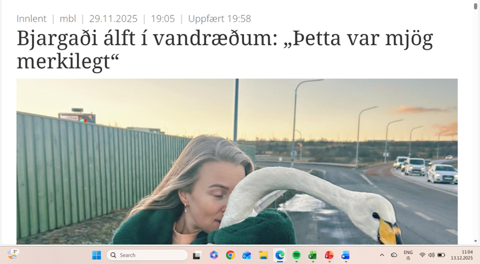 Eitthvað draumkennt við Svani, sennilega út af Dímmalimm – sem kyssti svan og hann breyttist í prins. Enn þetta er ævintýralega fallegur fugl og tignarlegur og þessi snerting mannsins við náttúruna hrífur mig – og hér er dásamlegt góðverk – ung kona sem bjargar álft í nauðum og færir út á Tjörn og svo er álftin færð úr sundlauginni á Seltjarnarnesi út og við Gróttu. Góðar sögur! Og sú seinni gerist daginn sem sundlaugamenning íslendinga er færð til bókar hjá UNESCO https://www.mbl.is/frettir/innlent/2025/11/29/bjargadi_alft_i_vandraedum_thetta_var_mjog_merkileg/