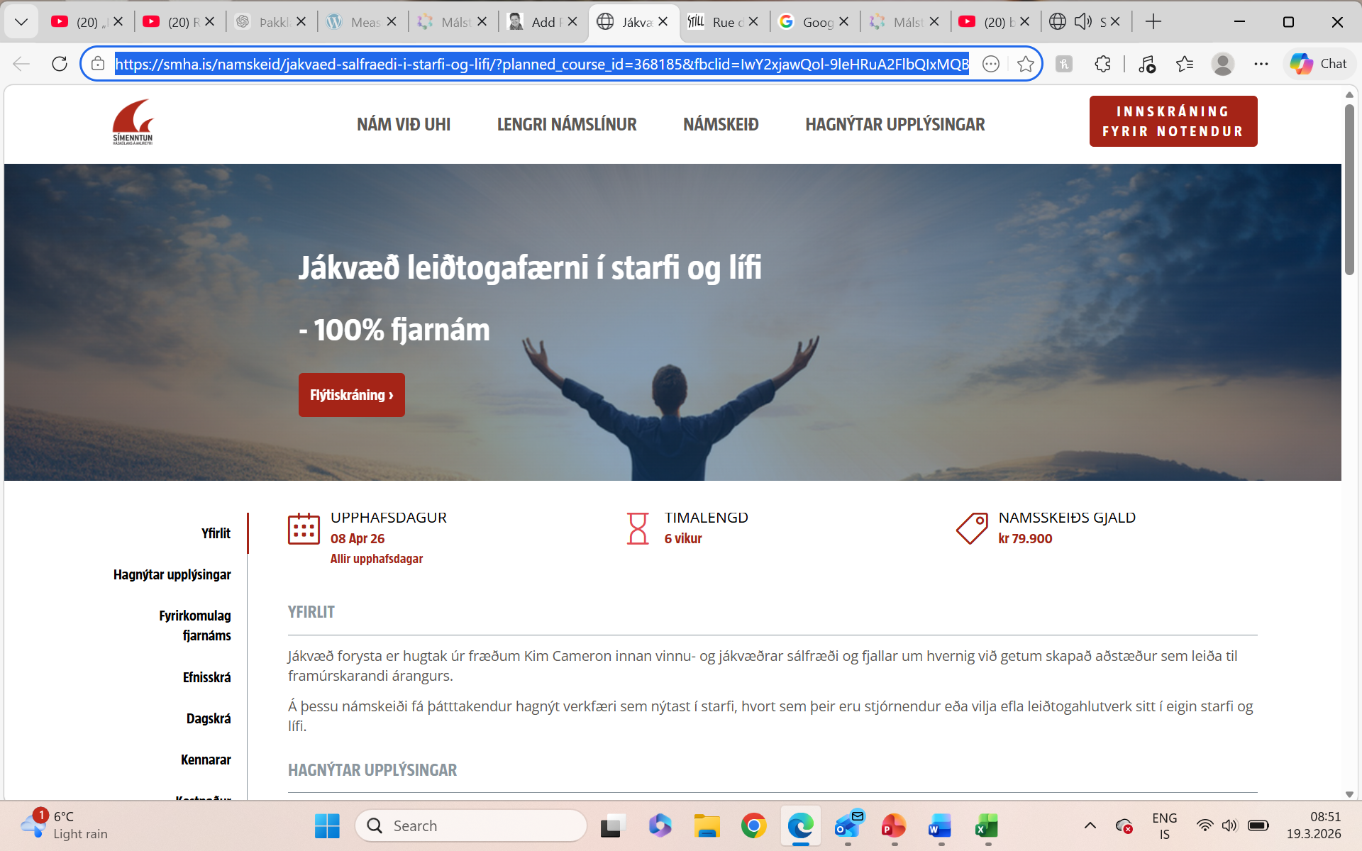 March 19, 2026March 19, 2026 Gaudeamus Netnámskeið – eftir páska; Jákvæð leiðtogafærni 1x í viku, 6 skipti Skráning og nánari upplýsingar hér: Jákvæð leiðtogafærni í starfi og lífi – Símenntun Háskólans á Akureyri Share this: Share on X (Opens in new window) X Share on Facebook (Opens in new window) Facebook Like Loading... Related